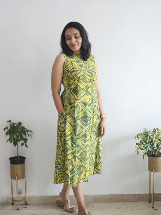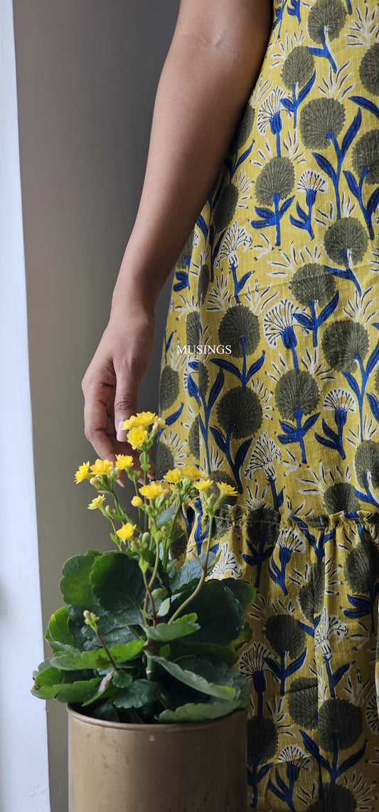 Daffodil - Kantha Stitched Sanganeri Handblock Printed Dress