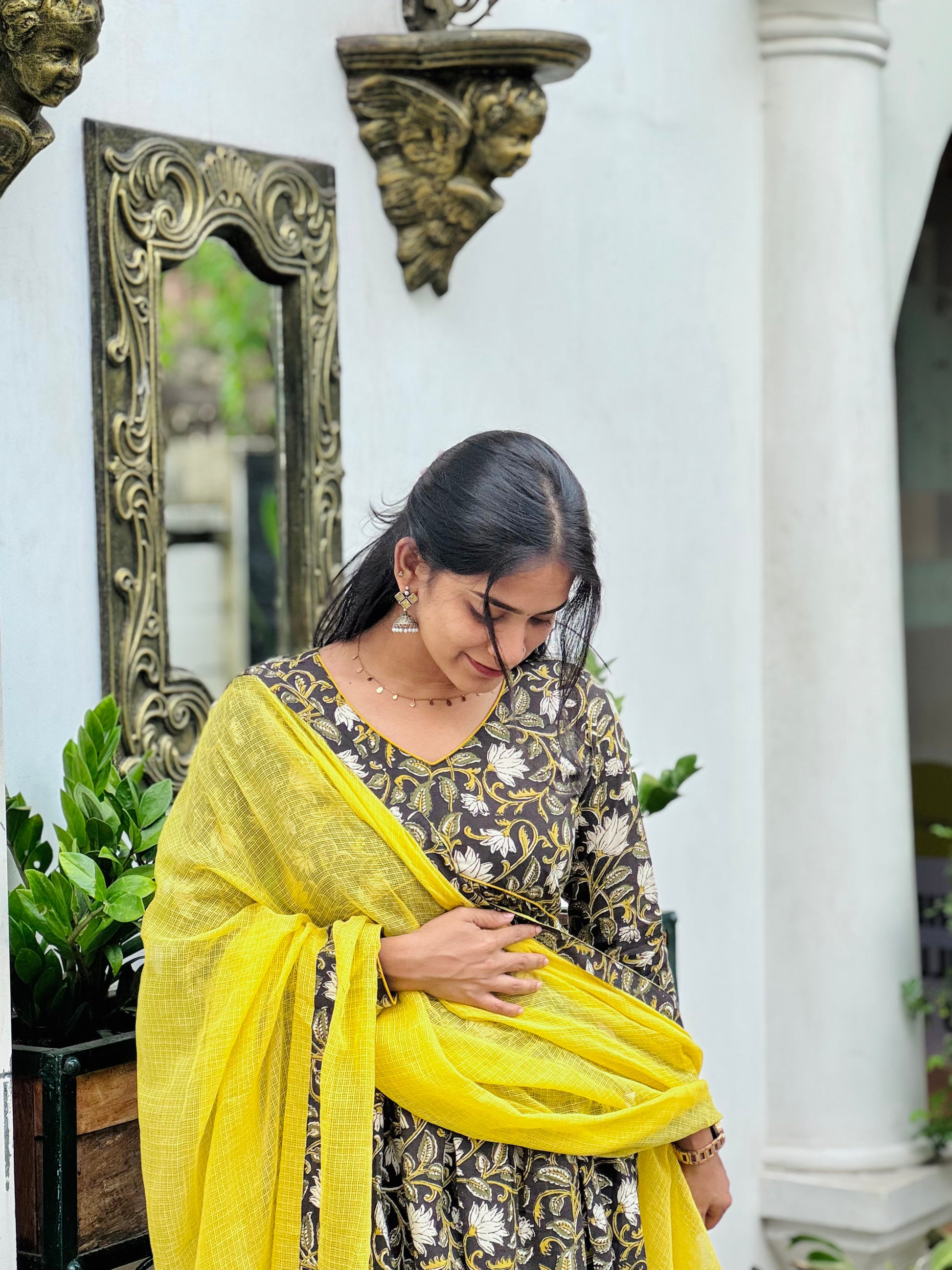 Elevate your style with our Aarudhra Alia Cut Kurta! Each piece boasts intricate Handblock printing and a stunning color combination for a unique and elegant look. The included Kota dupatta adds a touch of sophistication to this must-have piece. Let our kurta bring out your inner grace and beauty.