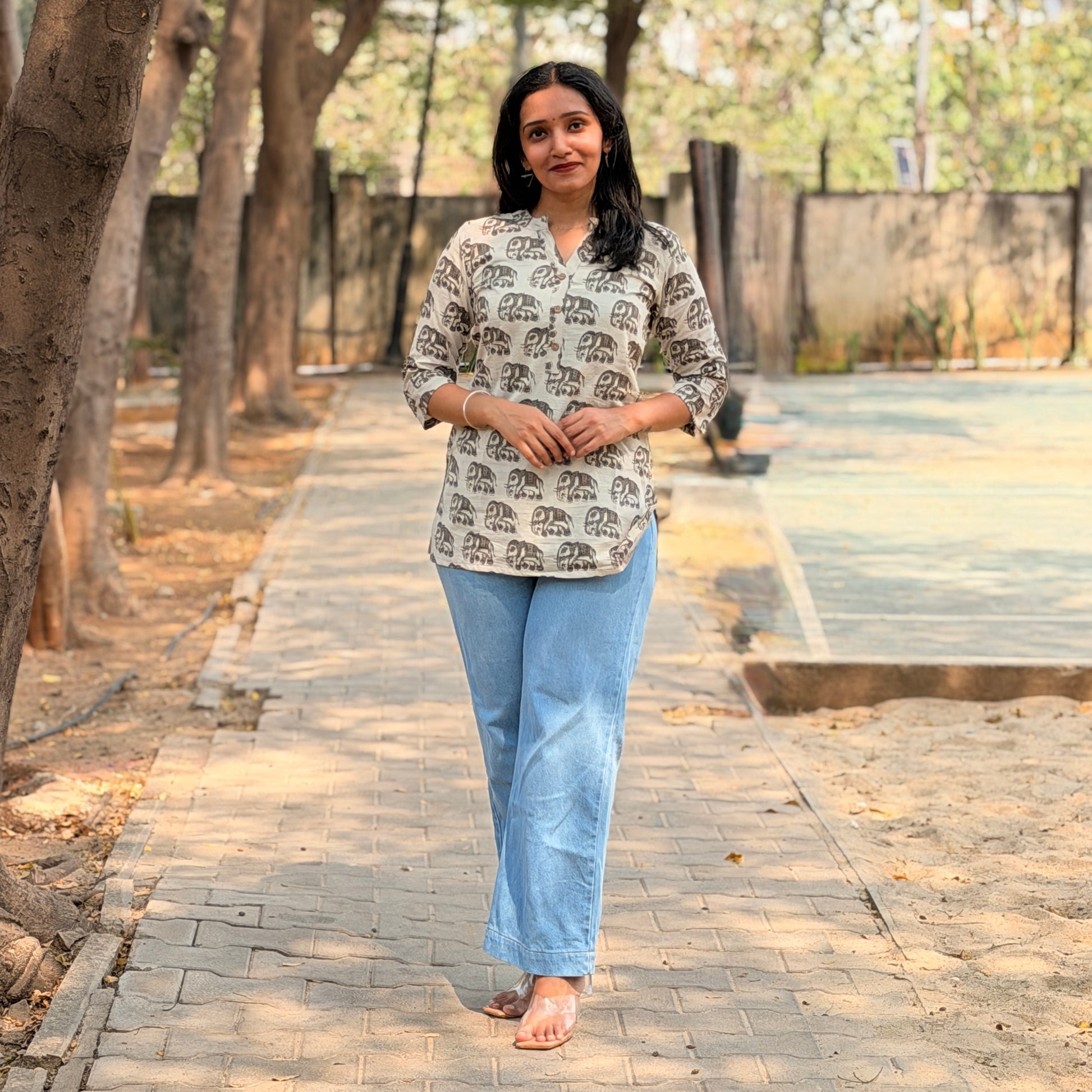 Embrace timeless elegance with the Anima kurta, a celebration of traditional craftsmanship. This features authentic bagru handblock printing—an ancient technique that creates unique, organic patterns impossible to replicate. Crafted from premium cotton, it's breathable, soft, and perfect for warm days. The cute, relaxed silhouette flatters all body types while maintaining an effortless charm.