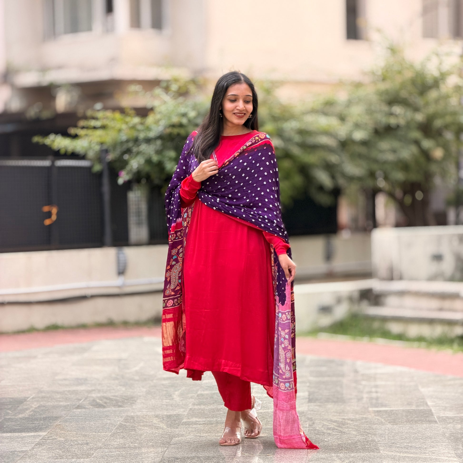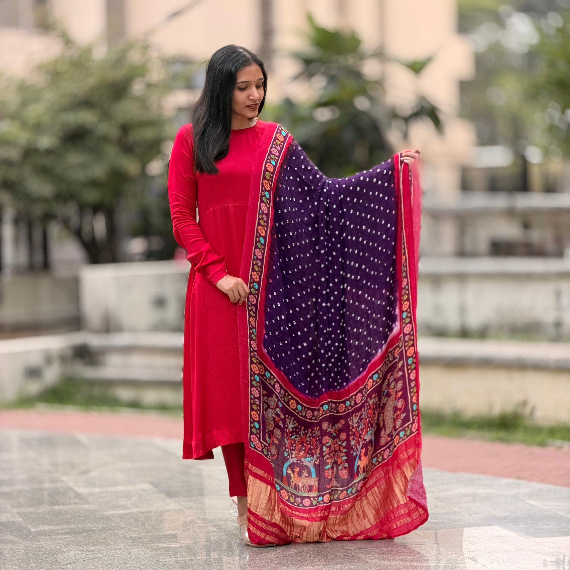 Drape yourself in timeless elegance with this exquisite Modal Silk Dupatta, where traditional Bandhini tie-dye meets intricate Kalamkari artistry. The luxurious lagda patti weave creates a fluid, graceful silhouette that elevates any ensemble. Handcrafted with meticulous detail, this piece celebrates heritage craftsmanship while offering modern comfort. Perfect for festive occasions or everyday sophistication, it's designed for those who appreciate the artistry of Indian textiles and refuse to compromise on quality.