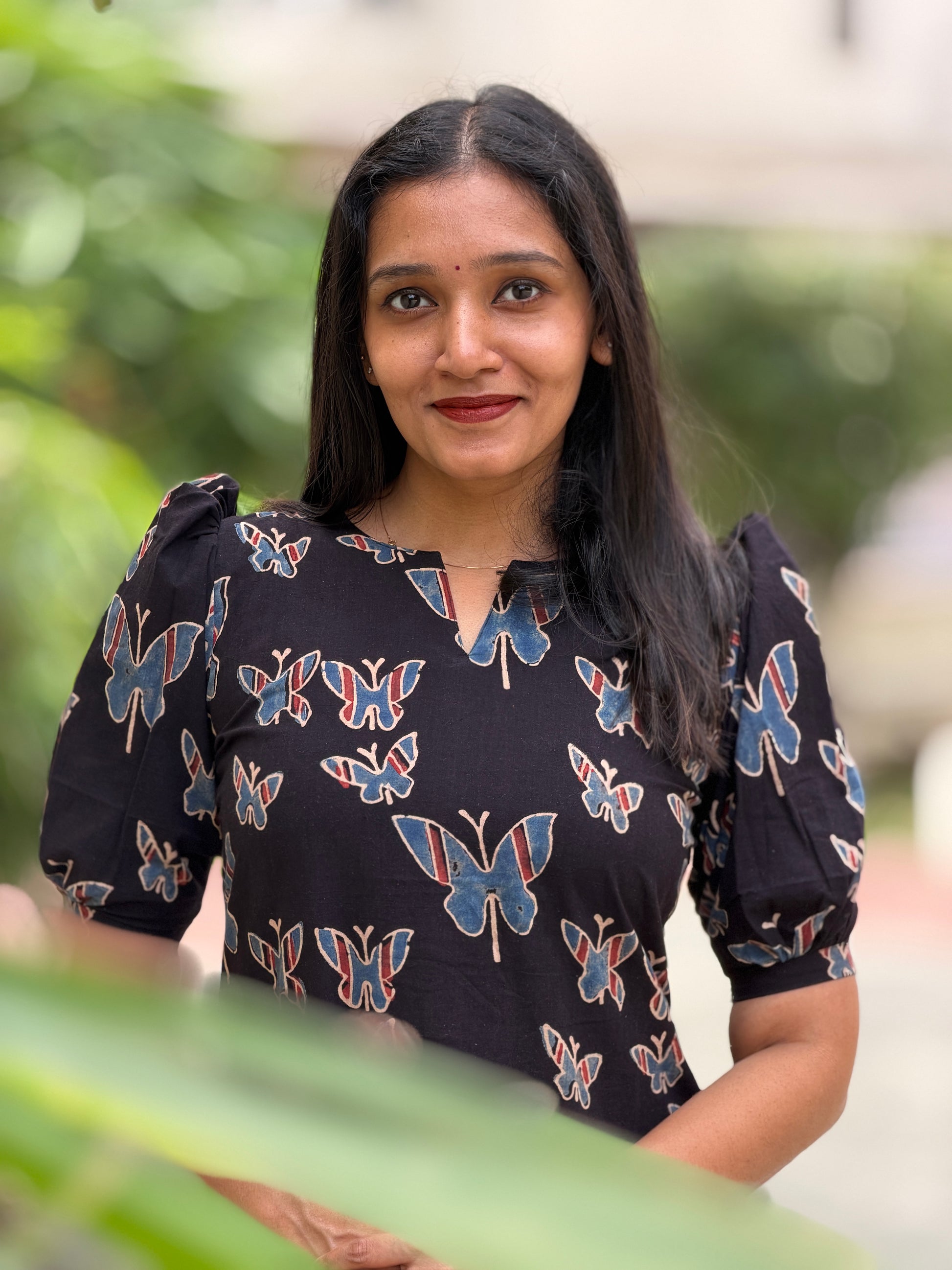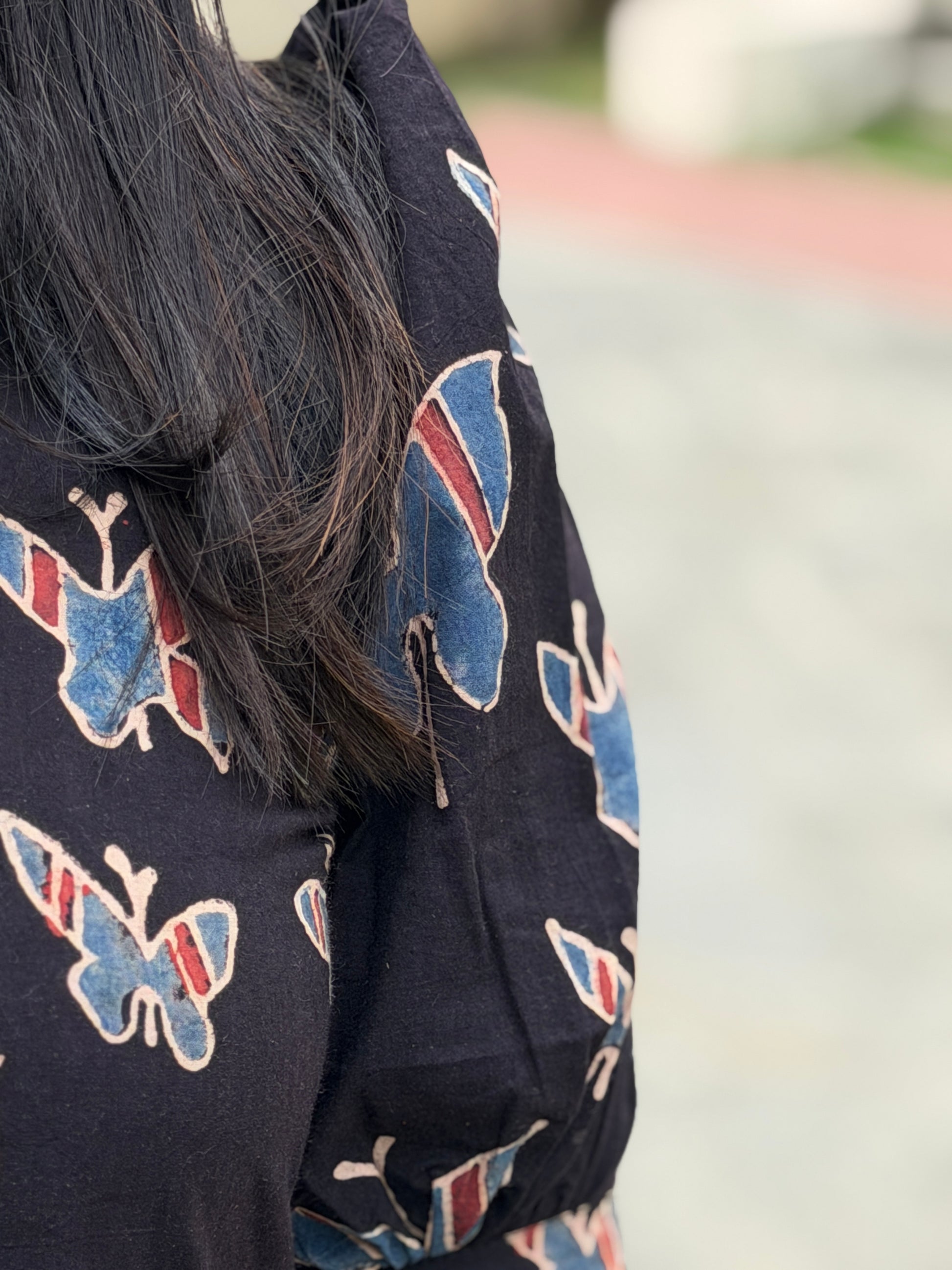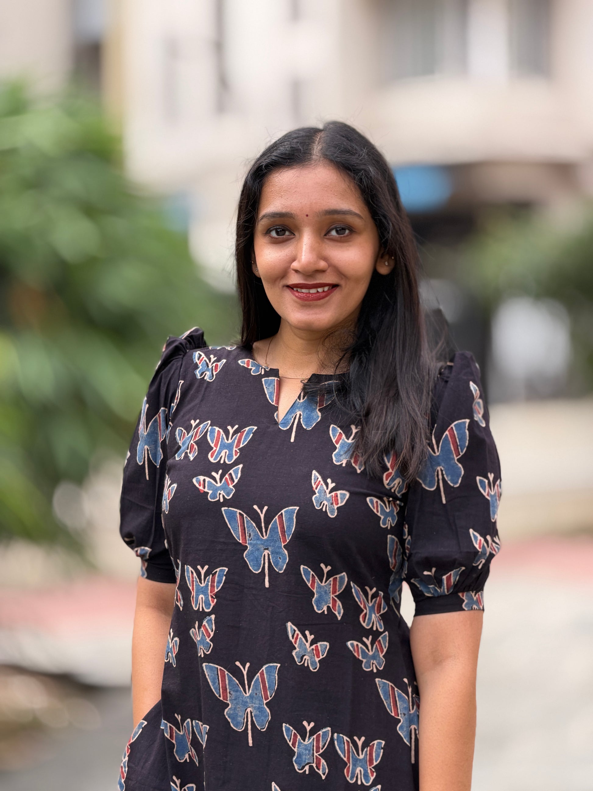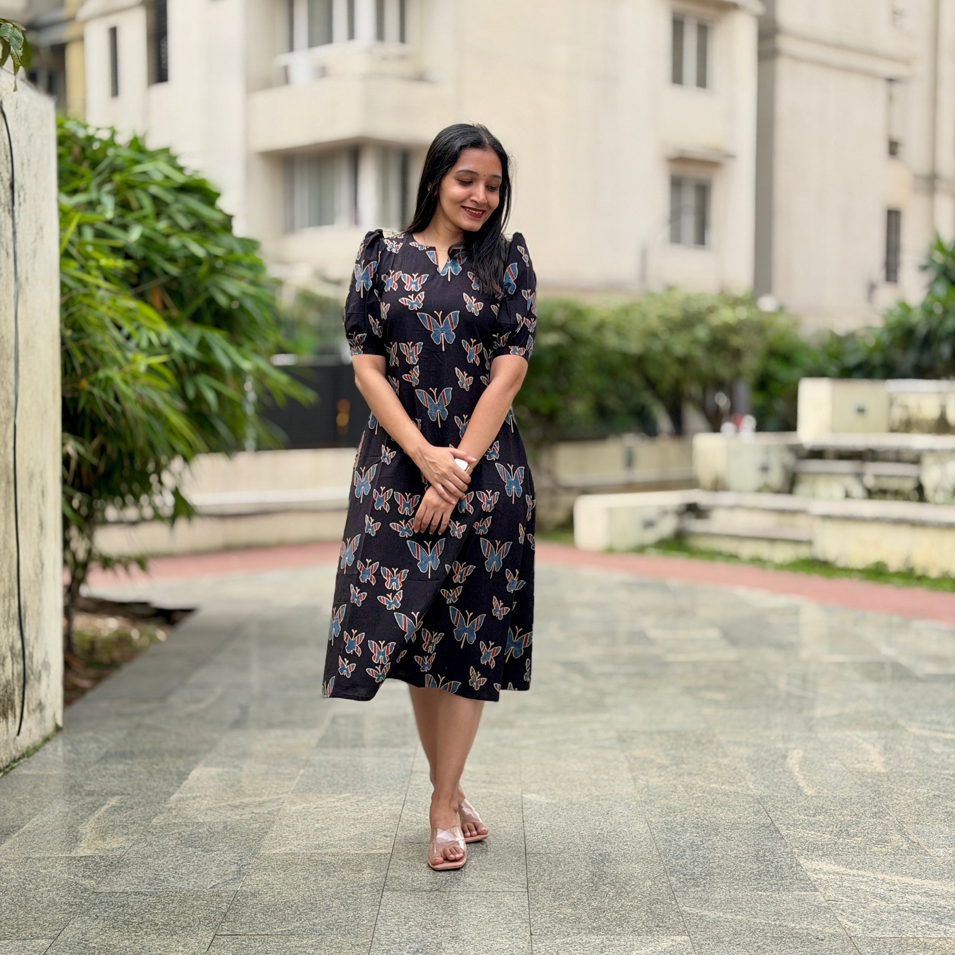 Butterfly Dreams celebrates the timeless art of Ajrakh through contemporary silhouette. This handblock-printed dress features organic cotton infused with natural dyes, creating rich, earthy tones that deepen with wear. The geometric patterns echo traditional craftsmanship while the modern cut ensures effortless elegance for today's wardrobe. Breathable, sustainable, and distinctly artisanal—a piece that honors heritage without compromise.