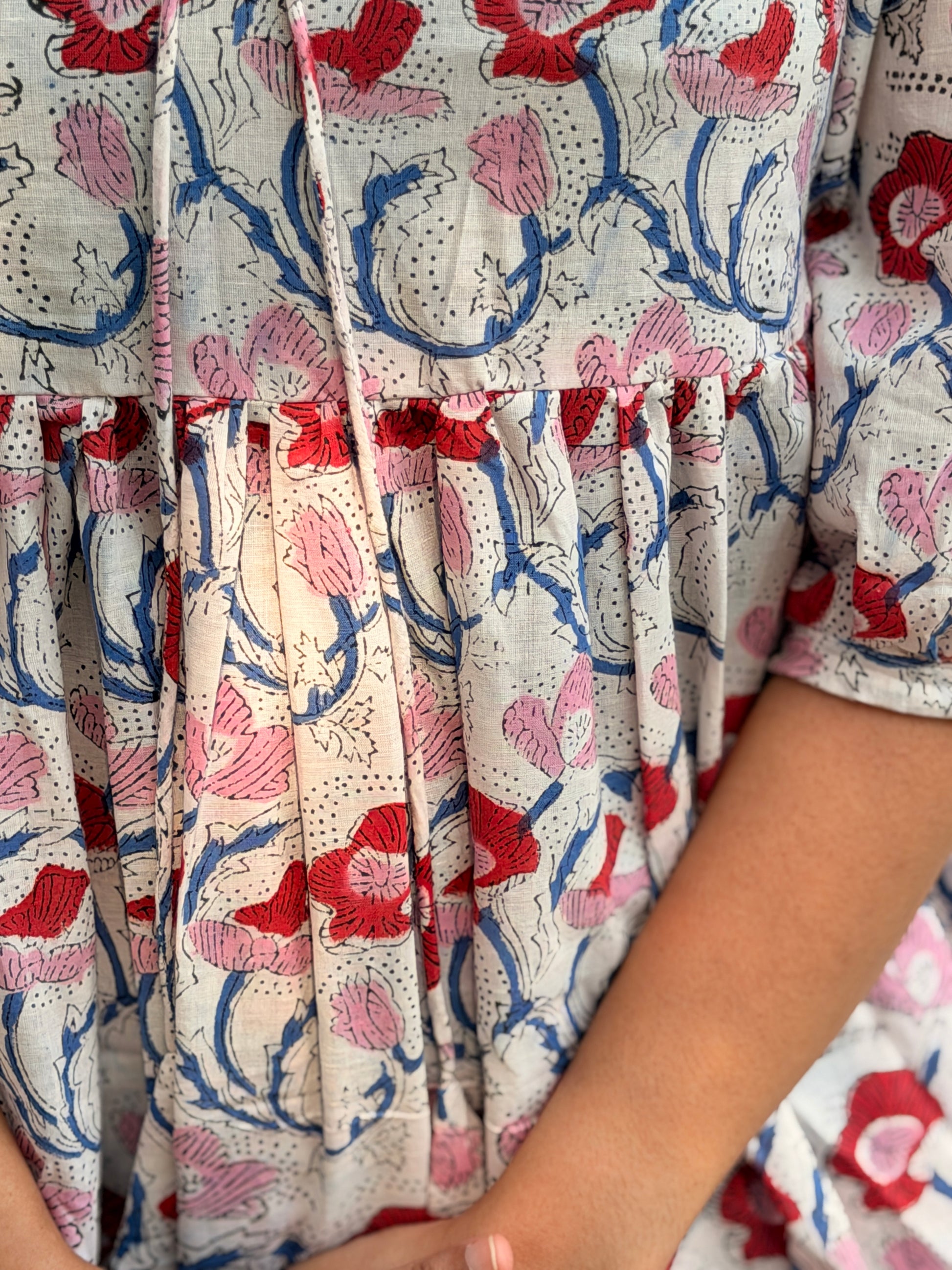Embrace timeless elegance with the Maira kurta, a celebration of traditional craftsmanship. This features authentic sanganeri handblock printing—an ancient technique that creates unique, organic patterns impossible to replicate. Crafted from premium cotton, it's breathable, soft, and perfect for warm days. The cute, relaxed silhouette flatters all body types while maintaining an effortless charm.