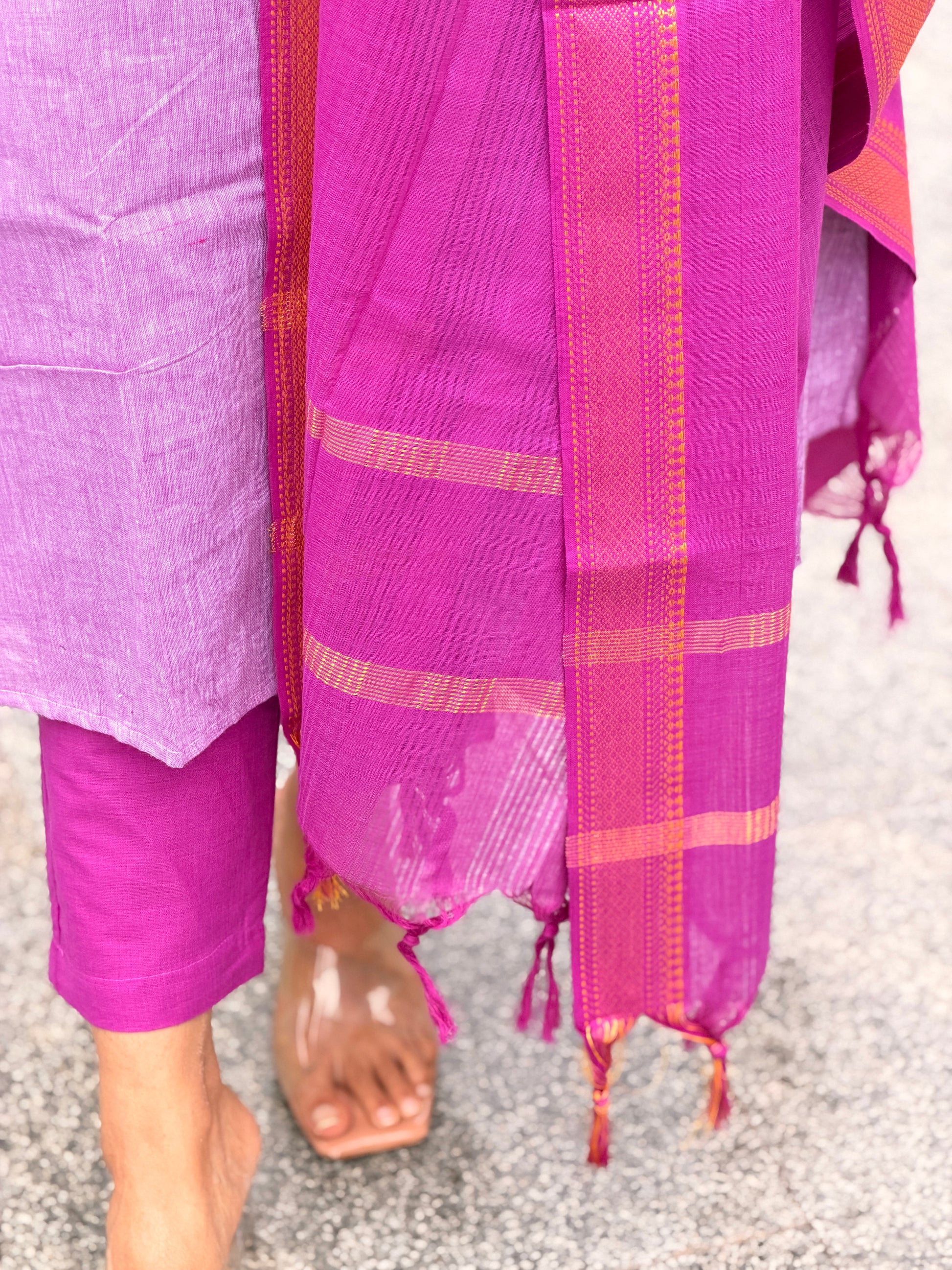 In lavendar and pink combination, this authentic Mangalgiri Kurta set offers the perfect blend of tradition and style for the contemporary woman. Made with high-quality Mangalgiri cotton, it is designed to provide comfort while still making a personal statement. Elevate your wardrobe with the Margazhi Kurta set today.