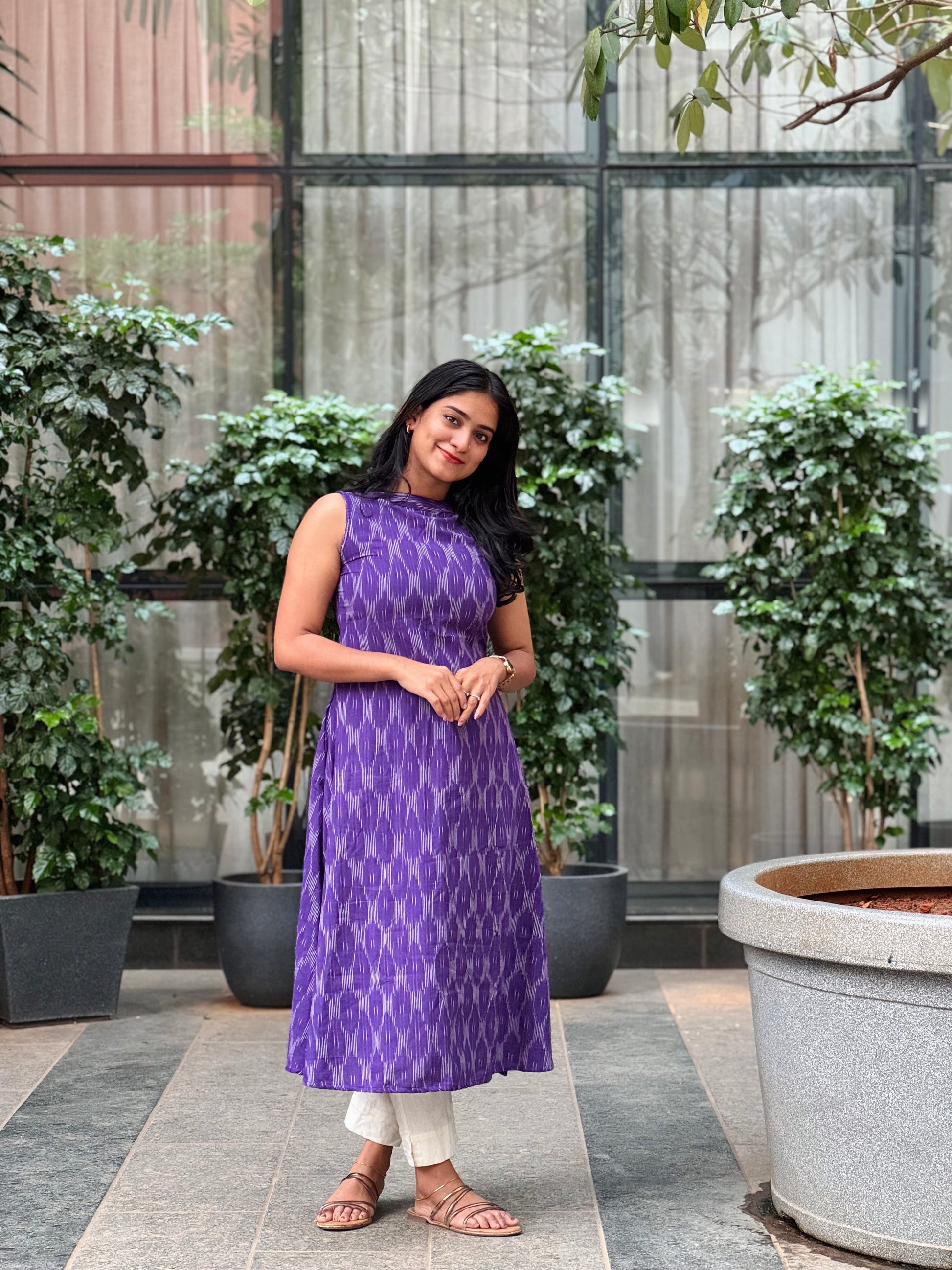 Elevate your wardrobe with the Yuva Ikkat Kurta & Dupatta Set, an exquisite ensemble that showcases the artistry of handwoven Ikkat in a captivating purple hue. This elegant piece, seamlessly transitioning from a refined dress to a sophisticated kurta, promises both comfort and an artisanal charm, making it an essential addition to your collection of timeless elegance.