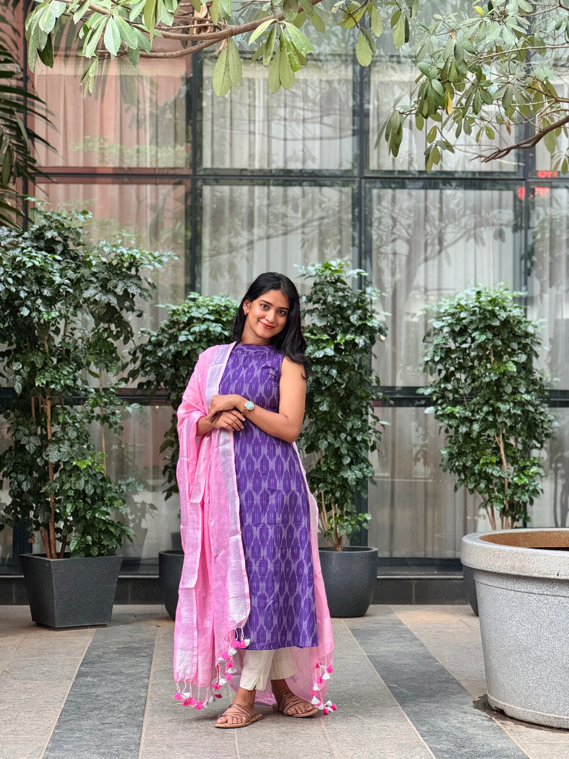 Elevate your wardrobe with the Yuva Ikkat Kurta & Dupatta Set, an exquisite ensemble that showcases the artistry of handwoven Ikkat in a captivating purple hue. This elegant piece, seamlessly transitioning from a refined dress to a sophisticated kurta, promises both comfort and an artisanal charm, making it an essential addition to your collection of timeless elegance.